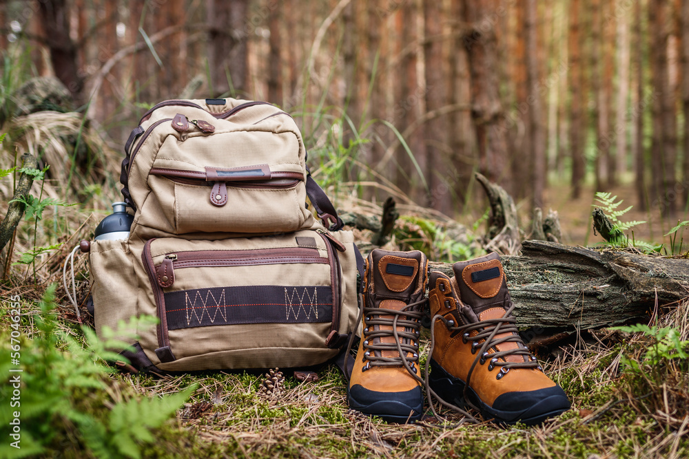 Hiking equipment in forest. Backpack and leather ankle boots