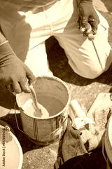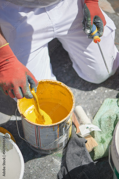 Professional painter at work. Unrecognizable young man uses a brush to apply special acrylic paint for road marking on asphalt of a parking lot.