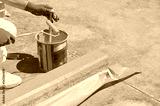 Professional painter at work. Unrecognizable young man uses a paint roller to apply special acrylic paint for road marking on a curb of a parking lot.