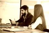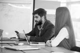 Bored businessman using phone during a meeting in office