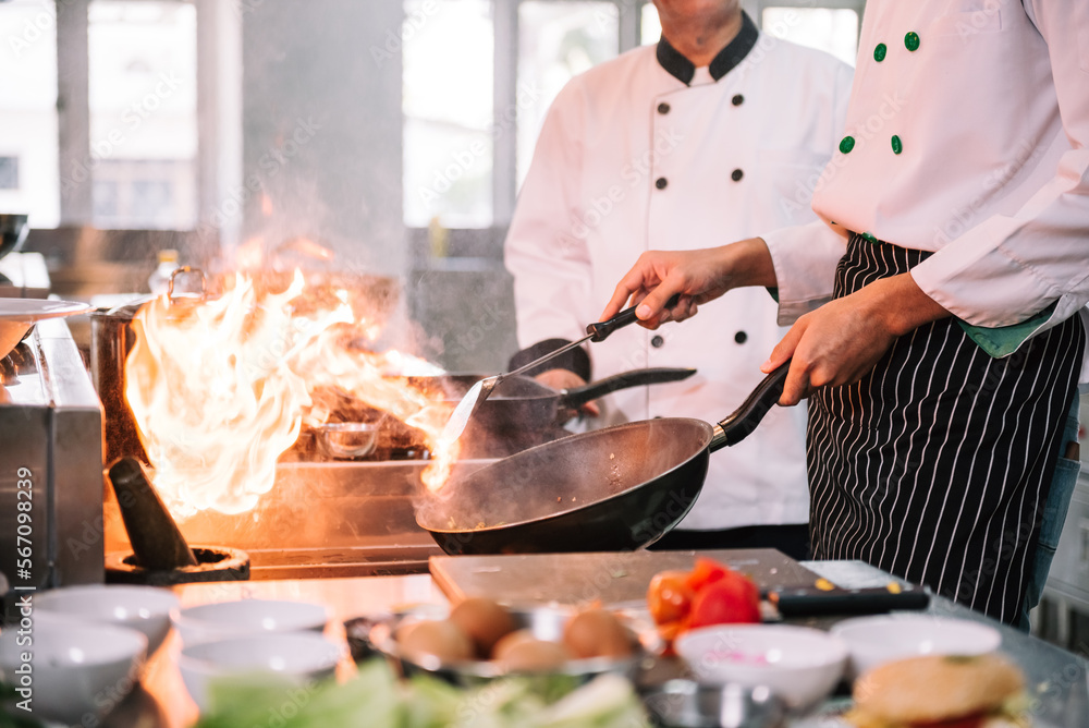 Professional mature chef looking to young chef cooking foods with high burning flames in restaurant.
