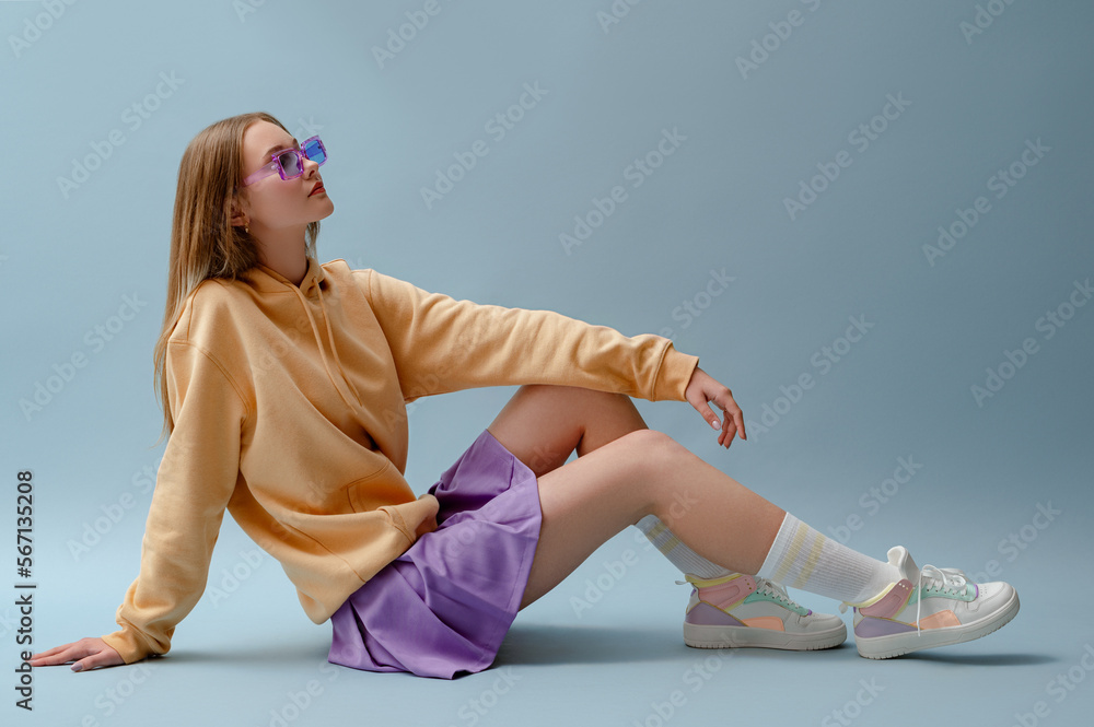 Fashionable confident girl wearing purple sunglasses, pleated mini skirt, yellow hoodie, socks, high top colorful sneakers, sitting, posing on blue background. Full-length studio portrait. Copy space