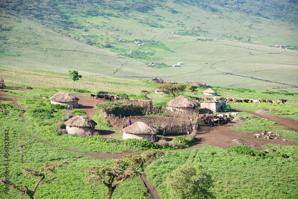 Maasai village with mud thatch huts called manyattas in Ngorongoro, Tanzania, Africa