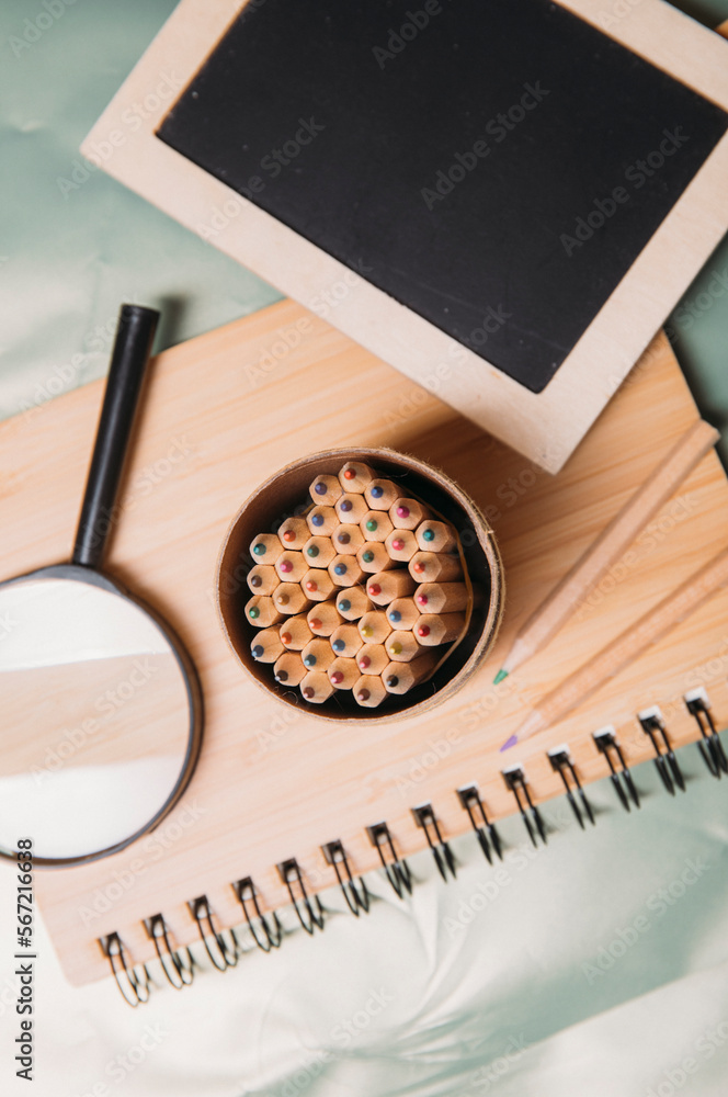 School education. Back to school. Supplies. Notebook. Photo. Background.