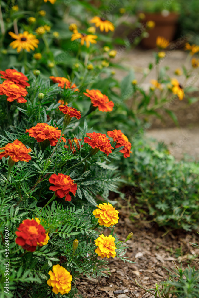 Orange and yellow French marigolds in bloom on concrete steps in a home garden during the summer