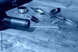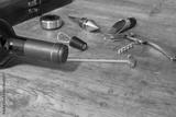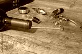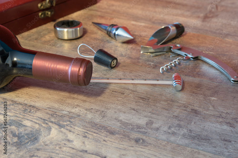 Accessories for bottled wine. Additional stoppers, means for opening, a corkscrew, a thermometer. On the texture table.