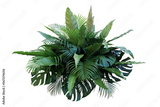 Tropical foliage plant bush (Monstera, palm leaves, and Bird's nest fern) floral arrangement indoors garden nature backdrop