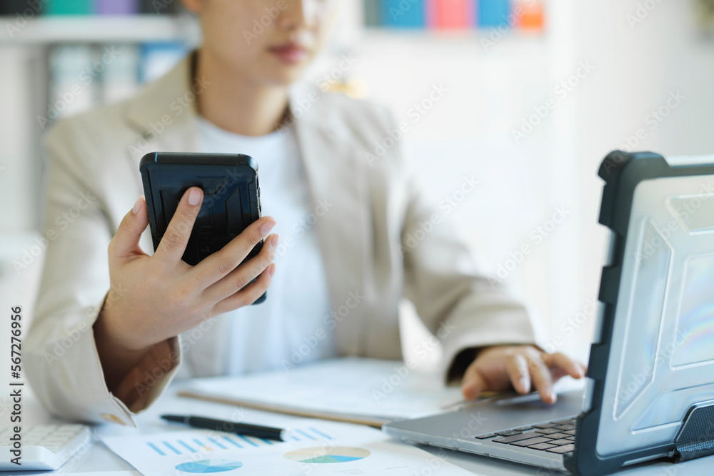 -.Close up young Asian businesswoman is working at office using mobile phone.