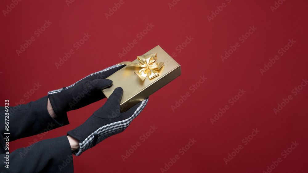 Female hands in elegant gloves hold a gift box with a bow in gold packaging. close-up. On a red background. copy space