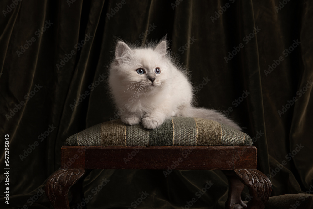 Fluffy ragdoll baby cat sitting on a classic green pouf in a classic still life setting