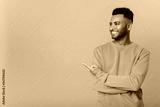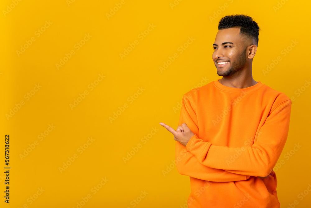 Cheerful indian man pointing at copy space on his finger, showing empty place for idea presentation, product advertising. Indoor studio shot isolated on orange background