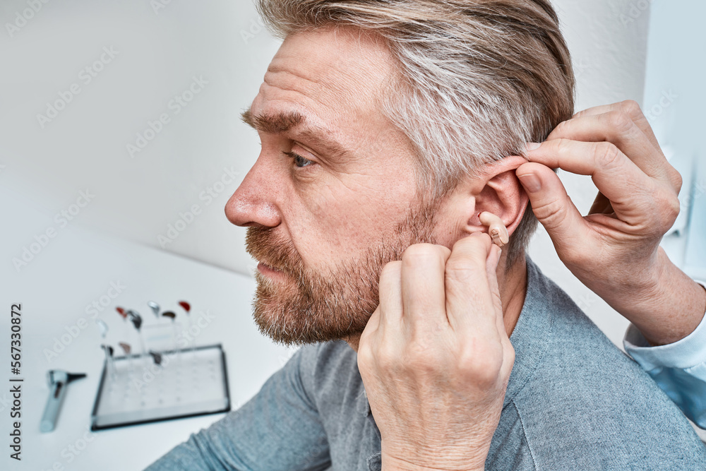 Audiologist inserting ITE hearing aid in adult man's ear at audiology center, close-up, side view. Deafness treatment, hearing solutions