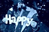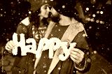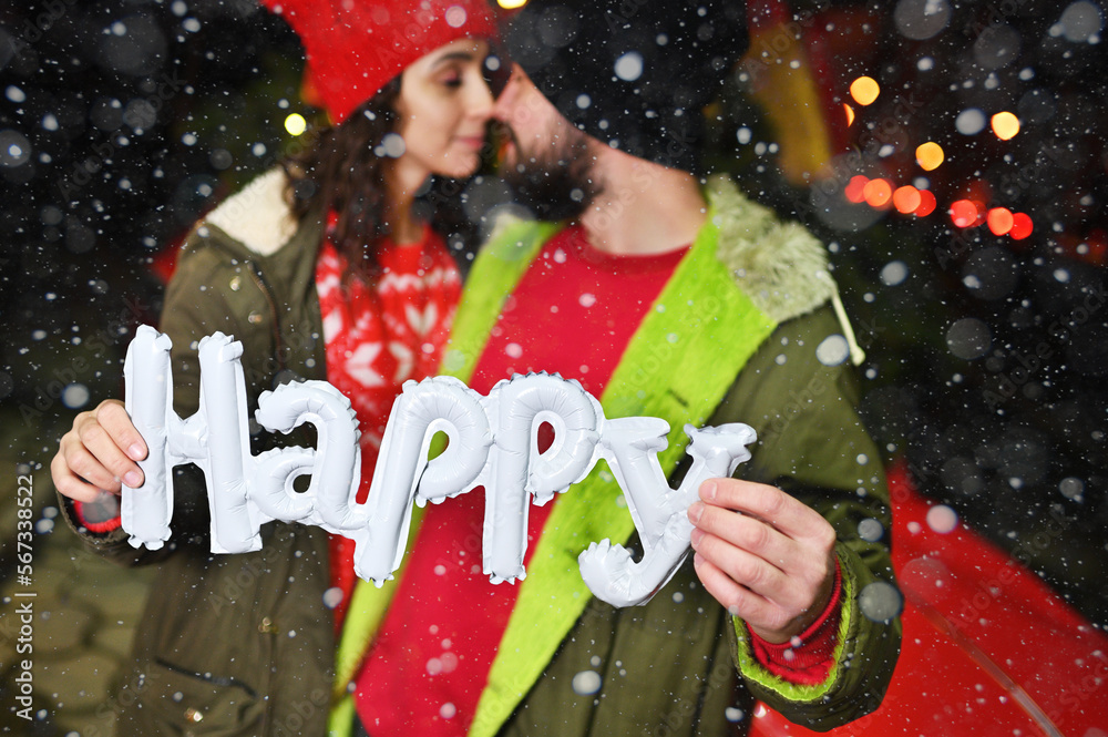 couple of lovers - a man and a woman kiss and hold in their hands the inscription happy on the background of falling snow.