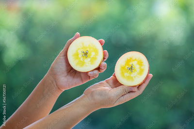 Fresh Honey core Apple over blur greenery background, Hand Holding Red Honey core Apple over green natural Blur background.