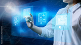 Close up of female student hands using digital screen for learning, education, e-classes