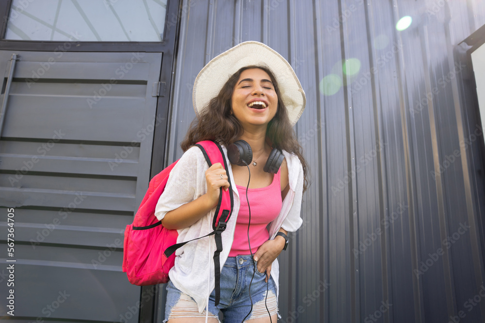 Cheerful Young Indian woman tourist traveler wear hat and backpack enjoy summer holidays vacations, lifestyle, fashion gilr. positive, carefree adult. Happiness.