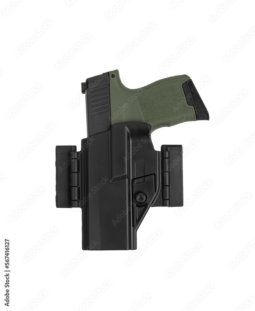 Short-barreled khaki weapon in a plastic holster. Armament for the army and police. Modern semi-automatic pistol isolate on a white back.