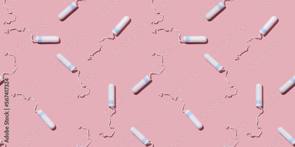 Women's tampons on a pink background pattern. Hygiene products for menstruation.