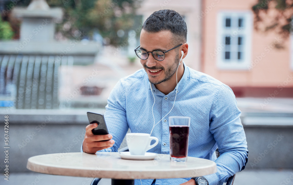 Online video communication. Young man sitting in a cafe and having communication with friends by using video call on smartphone. Lifestyle, technology