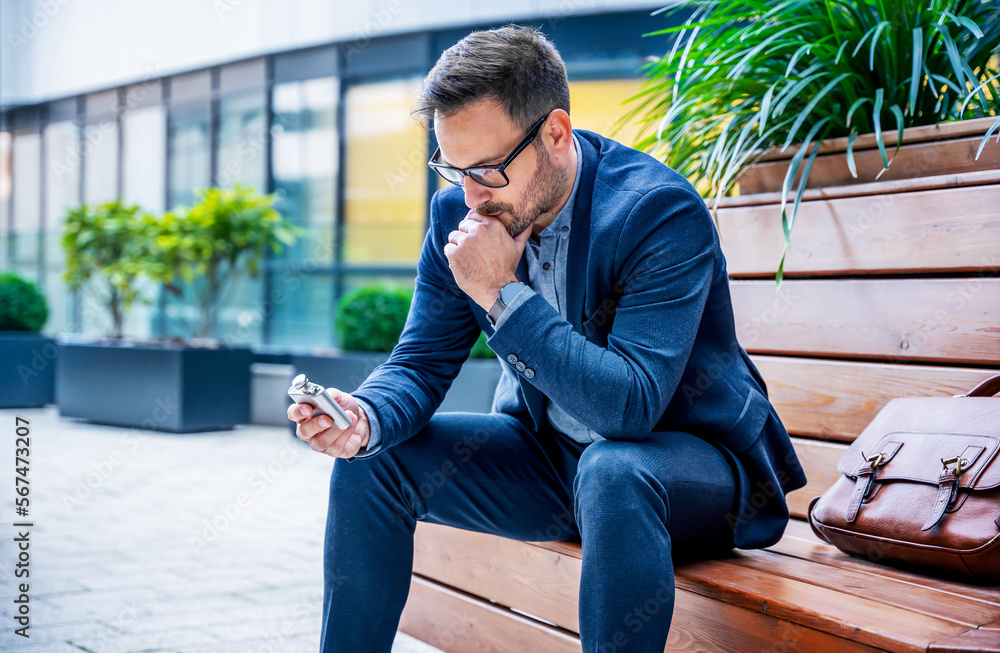 Business, stress and alcoholism. Fired depressed businessman drinking alcohol in front of corporation. Business concept