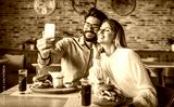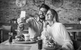 Young couple sitting in a cafe, having breakfast. Love, dating, food, lifestyle concept