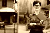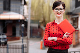 Confident smiling woman in glasses is showing red paper notepad with mock up and looking at camera outdoors on street background. Female in red polkadots blouse. Concept of advertising.