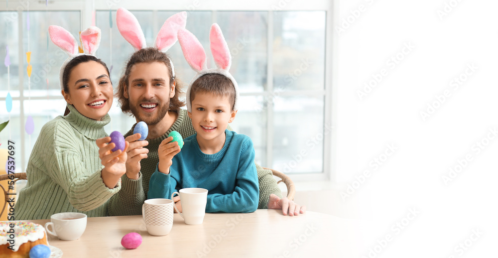 Happy parents and their little son with Easter eggs sitting at table. Banner for design