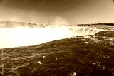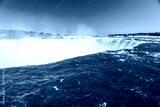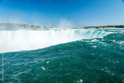 The greenish blue water at the brink of the Horseshoe Falls in Niagara Falls Ontario Canada. Mist from the falls rises in the distance.