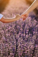 Happy family day. Mom holds her child daughter by hand in lavender field on summer day. Family outdoors in nature on sunset. Motherhood, childhood and care concept. Mothers day. Sun rays.