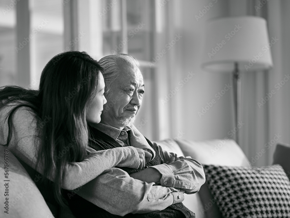 young asian daughter comforting elderly father black and white