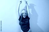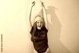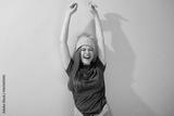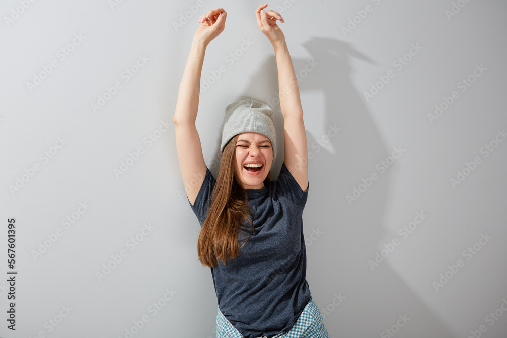 Happy woman in casual teenage style leaning against wall with arms up with closed eyes.