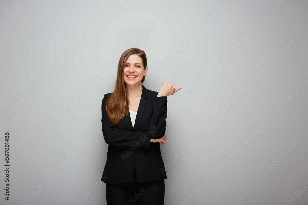 Business woman pointing finger at side copy space.