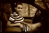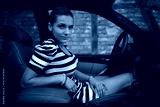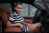 A young woman is sitting at a luxury modern crossover. The girl drives a new car. An attractive lady in a dress takes a look at the driver place in an SUV