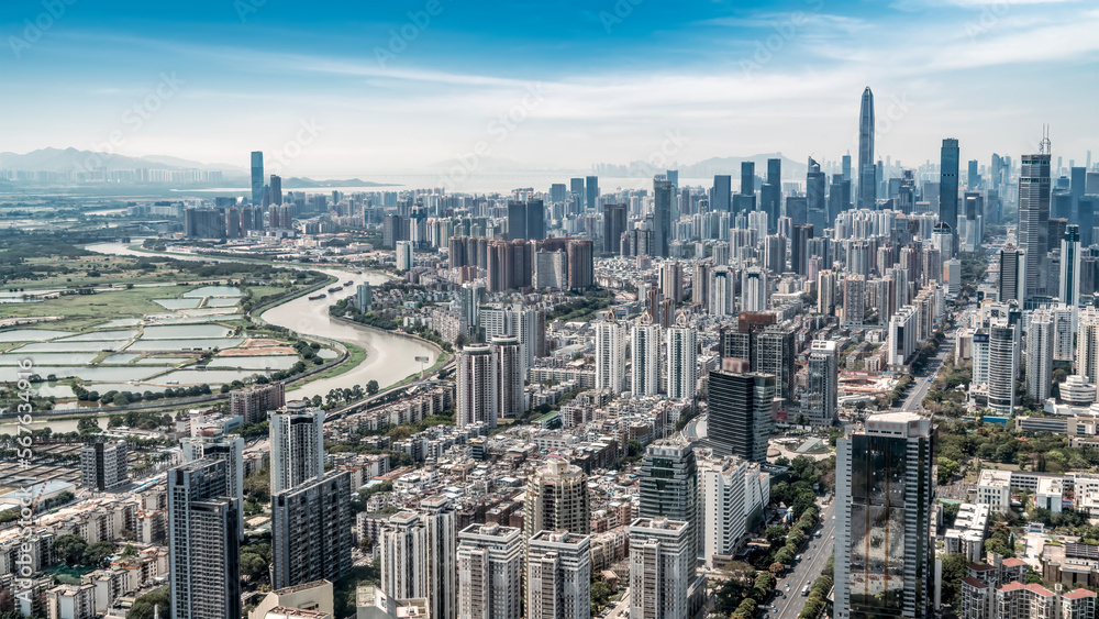 Aerial outdoor blue tone urban architectural landscape