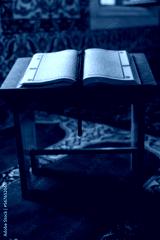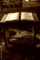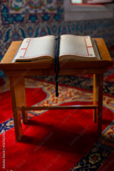 The Holy Quran on the lectern with a rosary or praying beads in the mosque