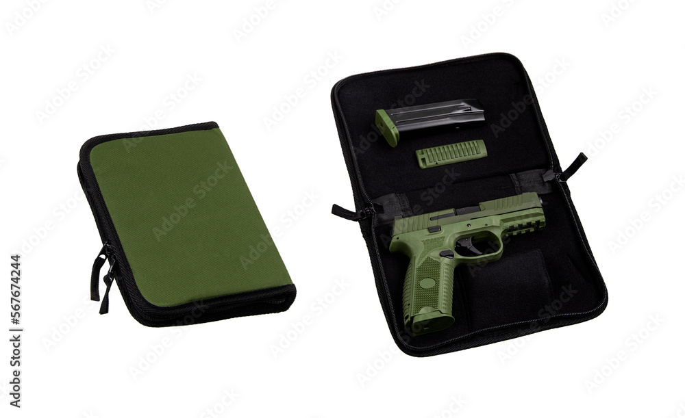 Modern semi-automatic pistol isolate on a white back. Armament for the army and police. Short-barreled khaki weapon.