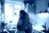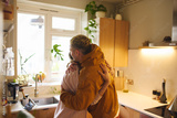 Young Happy Asian And Caucasian Same Sex Interracial Couple Hugging In Kitchen At Home