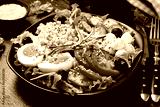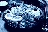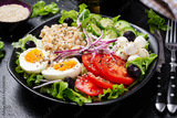 Healthy breakfast. Savory oatmeal with fresh cucumber, tomatoes, olives, lettuce, mozzarella cheese and boiled egg. Top view