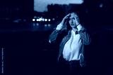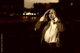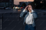 Portrait of young stylish girl on evening city background. Young woman walking in city street