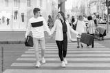 Young Man and woman walking together across the street after shopping. Couple with black bags with purchases.