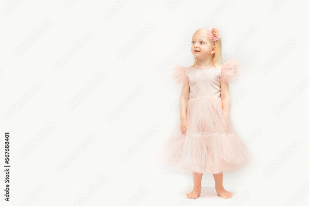 Pretty little girl in festive princess dress stands barefoots. Blonde Princess isolated on white background. Copy space