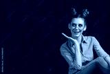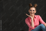 Smiling girl in glasses with interesting hairstyle points hand to black background. Place for your text, copy space