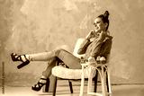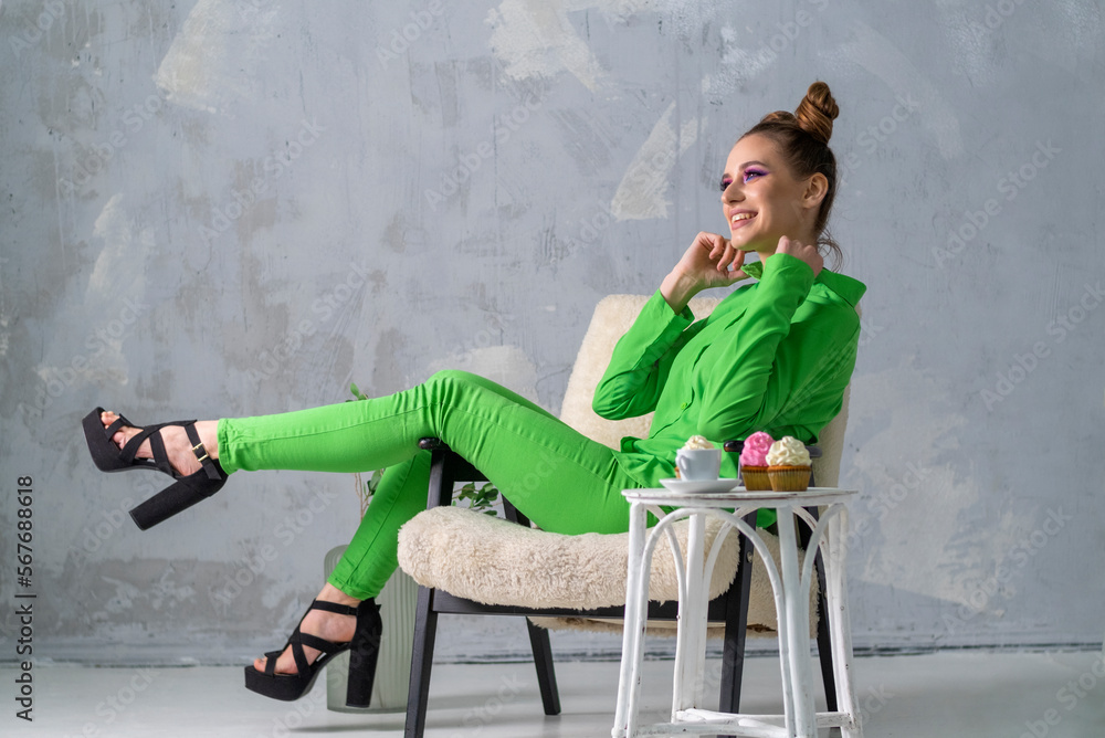 Happy cheerful woman in green wears sits on chair near table with coffee and cupcakes. Gray light room interior