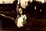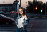 Sexy stylish young woman in glasses on evening city street background, summer time. Young pretty girl walk in city