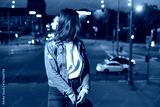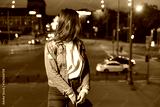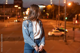 Young brunette woman in denim clothes on evening city background. Stylish girl walk in summer city street
