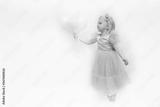 Beautiful child in lush pink dress with tulle skirt holds balloons in hands. Little elegant girl isolated on white background