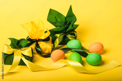 Festive Easter background. Colored eggs, gift boxes with ribbons on a yellow background.