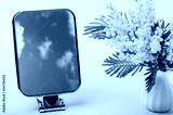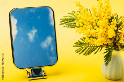 A bouquet of mimosa in a white vase and a mirror with a reflection of the sky..