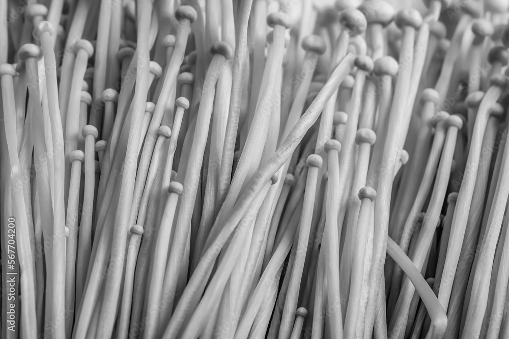 A bunch of enoki mushrooms close up. Abstract black and white image.