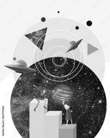 Contemporary art collage. Young man and woman finding out interesting information about space. Geometric elements design. Surrealism. Futuristic, abstract art. Concept of inspiration and creativity